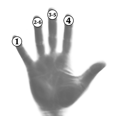 We must no longer count mentally as we need our mind to focus entirely on the visualizations—count subconsciously with your right hand as you move your thumb over each third of each finger.